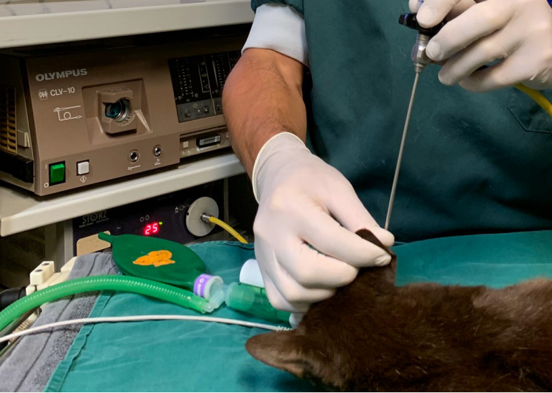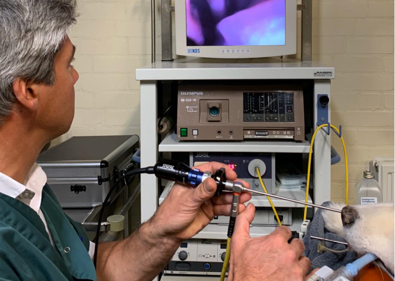 Bij honden en katten met luchtwegklachten is er vaak sprake van neusproblemen. Dit kunnen we onderzoeken door middel van rhinoscopie waarbij een kleine camera in de neus gaat en waar we eventueel biopten mee kunnen nemen. De problemen hierbij kunnen uiteenlopen van tumoren, poliepen en schimmelinfecties tot niesziekte bij katten. Bij honden met een korte snuit is er vaak sprake van zogenoemde kortsnuitobstructie (B.O.S) of ‘stick injury’ (splinters in de keel door een scherp object in de hals). In alle gevallen kunnen onze ervaren dierenartsen een passende behandeling bieden.
